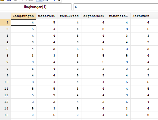 Terlihat bahwa nilai KMO overall 0.5515 > 0.5, artinya jumlah sample sudah mencukupi secara overall. Akan tetapi secara individual, variable lingkungan KMO nya 0.4839 < 0.5. Ini berarti sample nya kurang. Solusinya: sample di tambah, atau variable lingkungan tidak di-ikutkan dalam analisis faktor.