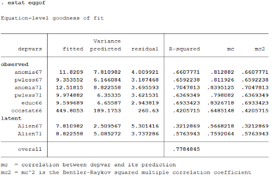 Terdapat 3 variable latent: alineation tahun 1967 (alien67), alienation tahun 1971 (alien71), dan social economic status (status sosial) tahun 1966.